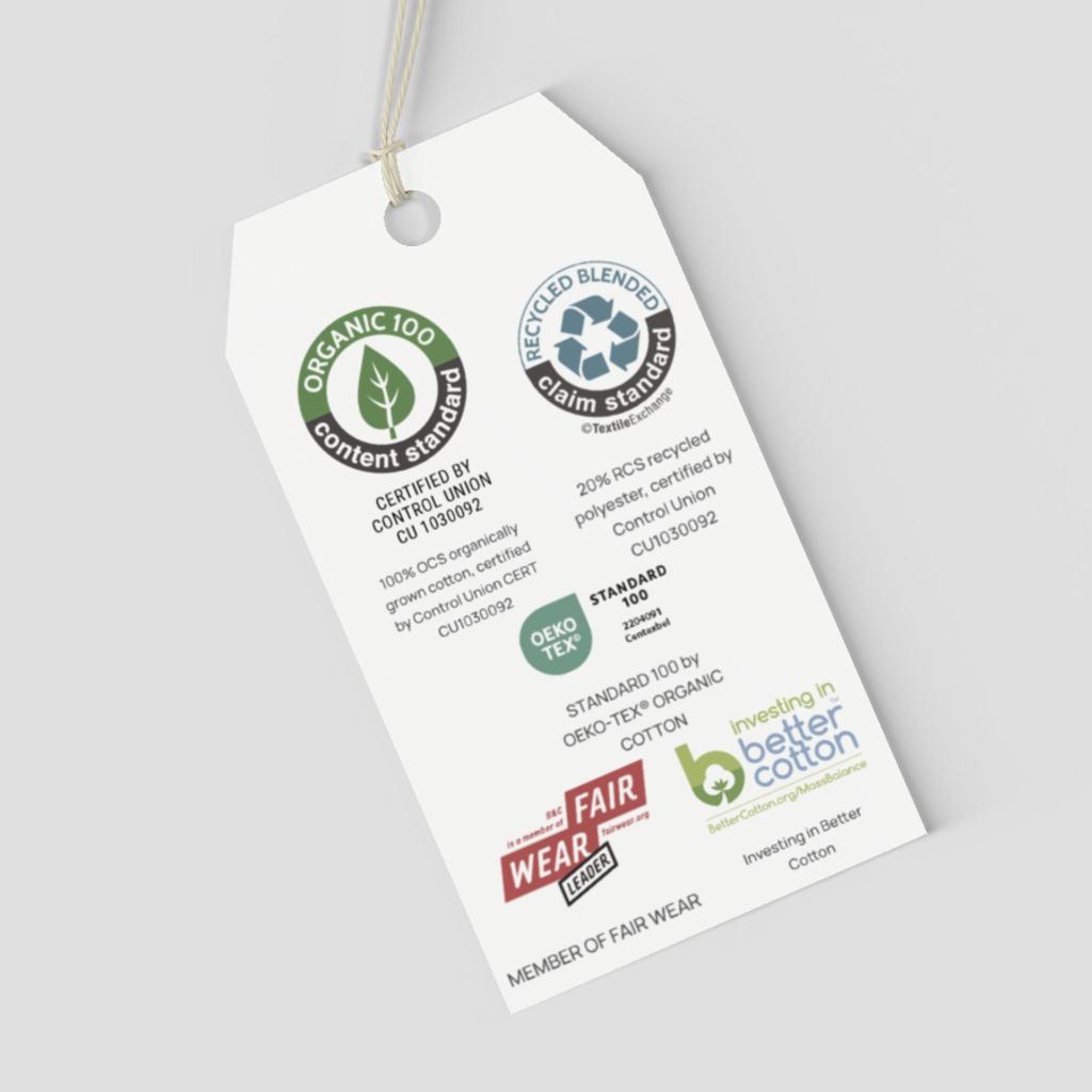 • Zertifikate Rohmaterial: OEKO-TEX Standard 100, Organic 100 Content Standard (CU 1030092), Recycled Blended Claim Standard; Engagement für Better Cotton